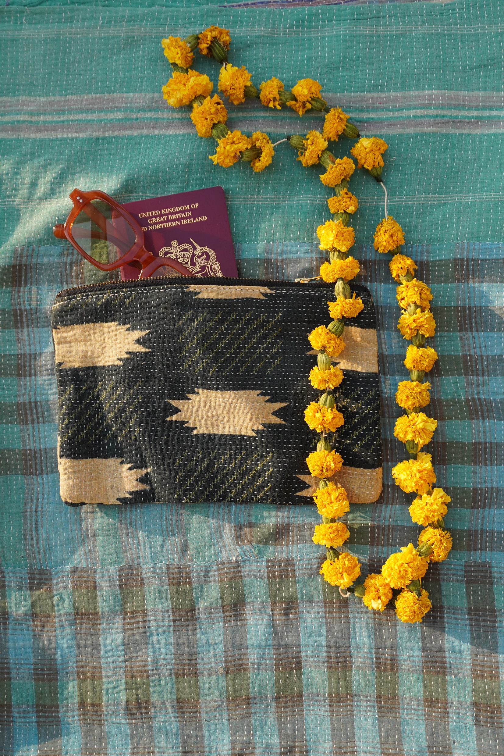 Hand selected Kantha pouch. These versatile pouches (20 x 30 cm) can be used for so many things making them a great gift. Be it a makeup bag, a large purse for carrying all your travel documents, a jewelry bag, a small bag for a night out. They have high quality metal zip fastening, an internal zipped pocket and another internal pocket.