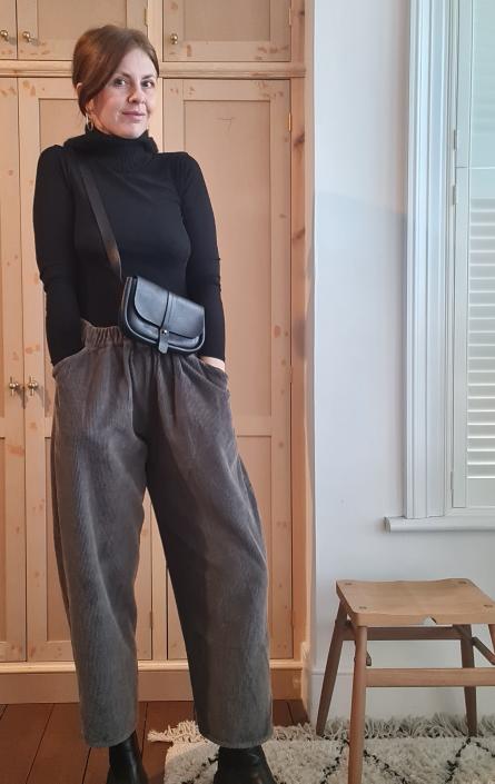 High quality 100% cotton corduroy balloon leg trousers with elastic waistband and pockets.
